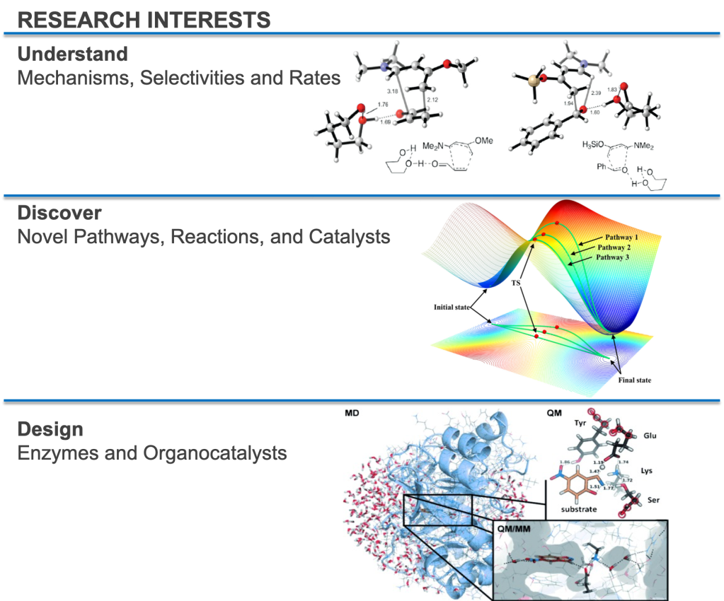 We focus on answering the bottleneck questions of organic and bioorganic chemistry events such as prediction of the reaction pathways, understanding of the enzyme functionalities and design of new enzymes with altered and improved properties using novel computational methods. Our current research topics include the development of new environmentally friendly catalysts for use in the synthesis of complex bioactive molecules of medical importance, getting an insight into the effect of mutations occurred by natural evolution on enzyme functionality and selectivity, identification of the non-selective enzyme activities and their improvement, understanding the origins and principles of the selectivity in multifunctional catalysts, development of new computational approaches to determine and design effective catalytic structures.